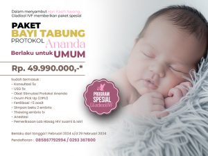 Gladiool IVF menawarkan paket program bayi tabung Protokol Ananda dengan harga Rp47.000.000. Paket ini dirancang secara komprehensif agar pasien dapat menjalani proses IVF dengan lebih nyaman, terarah, dan tanpa kekhawatiran berlebih terkait biaya tambahan.